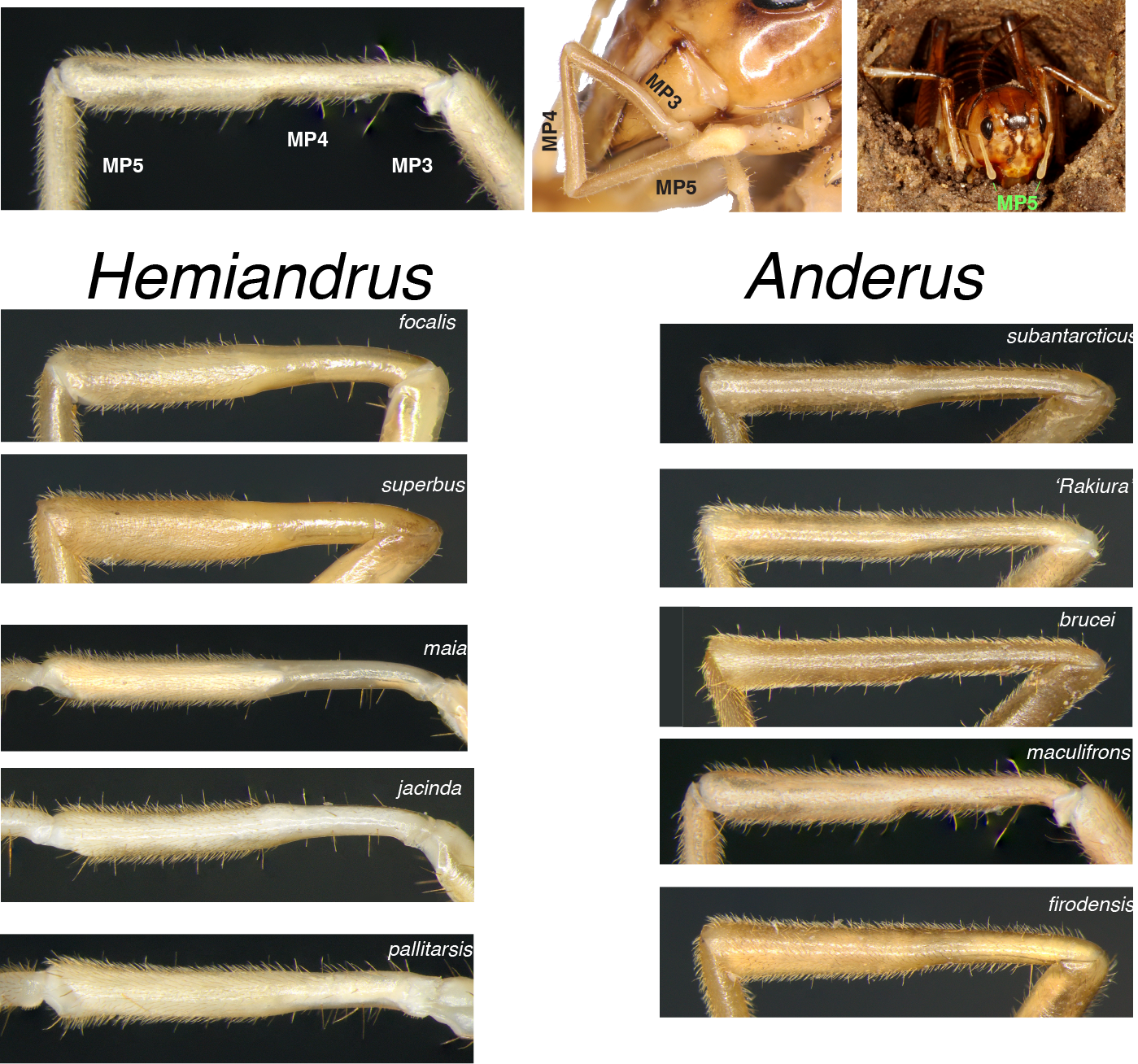 Until recently, all ground wētā were classified in the genus Hemiandrus. They are now (Trewick et al. 2024) divided into two genera that are not phylogenetic sisters; each is more closely related to separate lineages found outside Aotearoa New Zealand. Some Anostostomatidae species in Australia are superficially similar to some New Zealand species but belong to a separate lineage that has yet to be formally described. All species hide in burrows in the ground during the day usually closing the entrance with soil. During the night ground wētā emerge to forage on plants and invertebrates. Ground wētā do not have ears like those of tree wētā on their forelegs, but they do use vibration signals to communicate. Hemiandrus or Anderus? All species of Anderus have females with long ovipositors, but Hemiandrus includes species that have long, medium or very short ovipositors. However, the two genera can be distinguished with the aid of a magnifying lens by examining the maxillary palps.